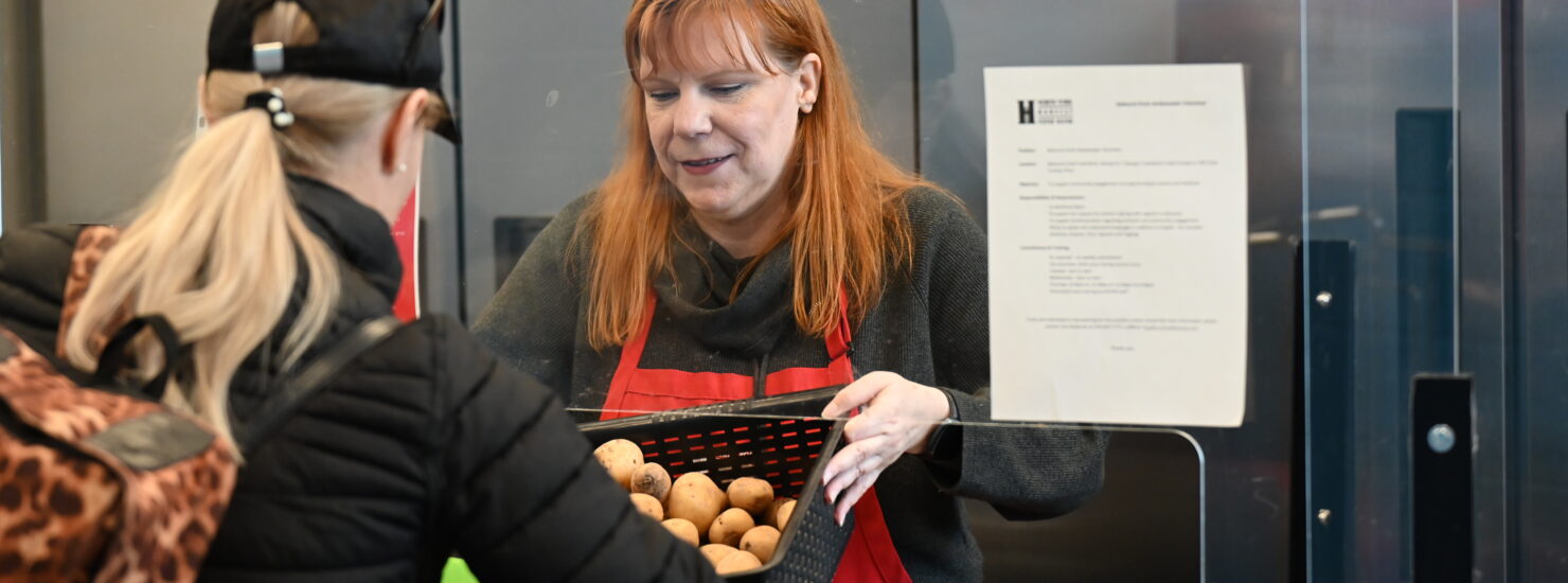 A woman in a red North York Harvest Food Bank apron serves food to a client.